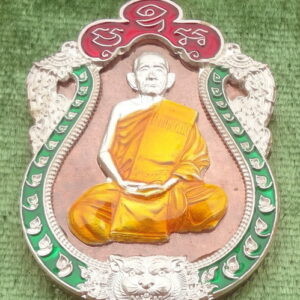 เหรียญเสมาหัวเสือ รุ่นแรก ปี 61 เนื้อเงิน ลงยาบนสีเขียว/ขอบสีแดง จีวรเหลือง หมายเลข ๗ หลวงปู่บุญมา วัดบ้านแก่ง จ.ปราจีนบุรี