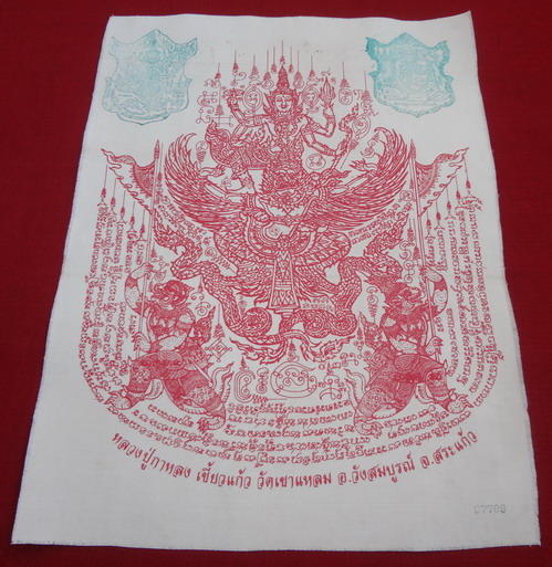 ผ้ายันต์พระนารายณ์ทรงครุฑ (ยันต์นารายณ์มหาปราบ) รุ่นแรก หลวงปู่กาหลงเขี้ยวแก้ว วัดเขาแหลม จ.สระแก้ว รุ่นไหว้ครู ปี พ.ศ.2550 ผ้าดิบสีขาวพระยันต์สีแดง ปั๊มโค๊ตและหมายเลข 07709 ขนาด 12 X 16 นิ้ว (31 x 41 ซ.ม.) จำนวนสร้าง 9,999 ผืน