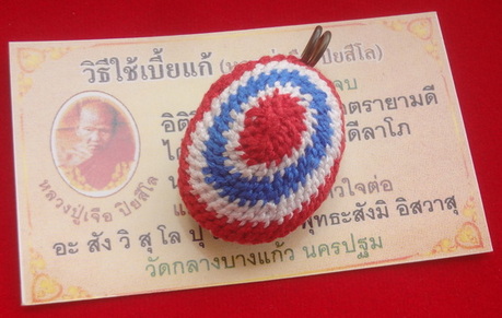 เบี้ยแก้ถักลายธงชาติห่วงทองแดงเดี่ยว 2 ห่วง หน้าสีแดง หลังสีแดง หลวงปู่เจือ วัดกลางบางแก้ว จ.นครปฐม ปี พ.ศ.2550 ขนาดตัวเบี้ยรวมห่วง กว้างประมาณ 2.8 ซ.ม. หน้าเบี้ยถึงท้องเบี้ยประมาณ 2.2 ซ.ม. สูงรวมห่วงทองแดงประมาณ 4.5 ซ.ม. (ป้ายแดงพร้อมคาถาบูชาครับ)