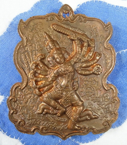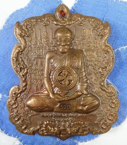 เหรียญรูปเหมือนหลวงปู่กาหลงเขี้ยวแก้ว หลังพระนารายณ์ขว้างจักร วัดเขาแหลม จ.สระแก้ว รุ่นจักรพรรดิ์นารายณ์ ที่ระลึกงานพิธีไหว้ครูบูรพาจารย์ ปี พ.ศ.2551 เนื้อสัมฤทธิ์ขอมโบราณพันปี โค๊ตและหมายเลขเลเซอร์ หมายเลข 5208 จำนวนสร้าง 9,999 เหรียญ