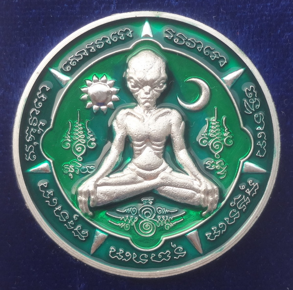 เหรียญมงคลจักรวาล ปี 63 เนื้อเงิน ลงยาสีเขียว หมายเลข 14 พระอาจารย์เล็ก วัดถ้ำเขาน้อย จ.เพชรบุรี