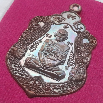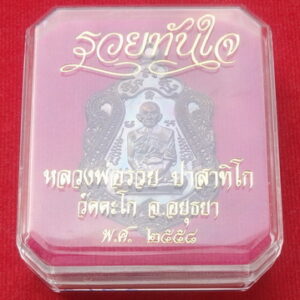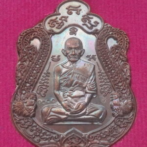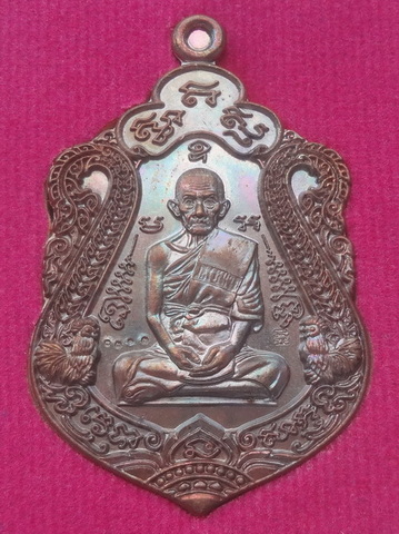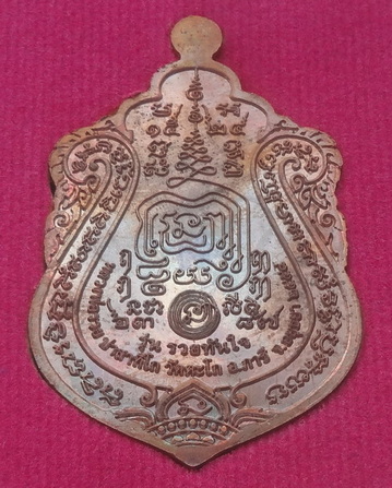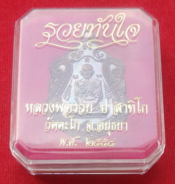 เหรียญเสมา รุ่นรวยทันใจ หลวงพ่อรวย วัดตะโก จ.พระนครศรีอยุธยา วันที่ 24 เมษายน พ.ศ.2558 เนื้อทองแดง ตอกโค๊ตและหมายเลข ๓๓๑๓ ขนาดเหรียญรวมห่วงตัน 2.8 x 4.3 ซ.ม. จำนวนสร้าง 10,000 เหรียญ