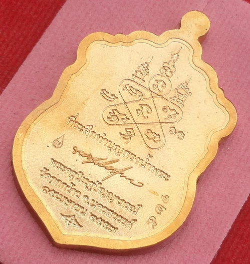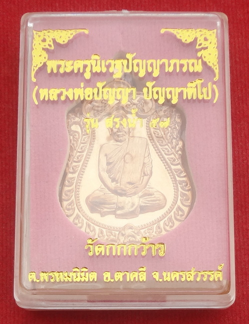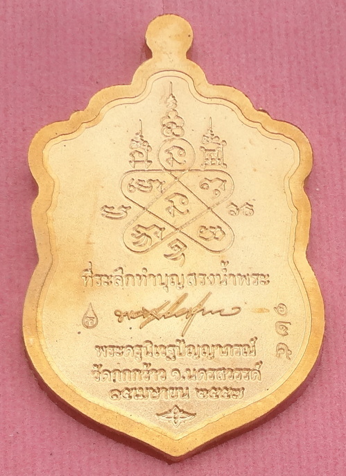 เหรียญเสมาสรงน้ำ หลวงพ่อปัญญา วัดกกกว้าว อ.ตาคลี จ.นครสวรรค์ ปี พ.ศ.2557 เนื้อทองสัตตะ ตอกโค๊ตและหมายเลข _ _ _ (เลขไทย) ขนาดเหรียญรวมห่วงตัน 2.7 x 4.3 ซ.ม. จำนวนสร้าง 990 เหรียญ