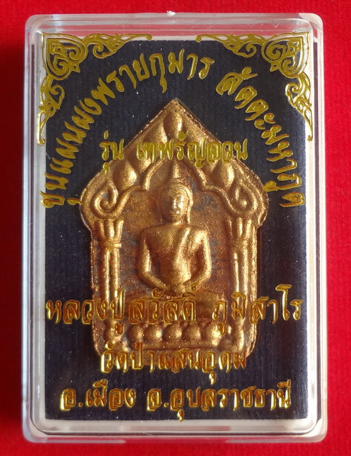 ขุนแผนผงพรายกุมาร รุ่นเทพรัญจวน หลวงพ่อสวัสดิ์ วัดป่าแสนอุดม อ.เมือง จ.อุบลราชธานี วันอาทิตย์ที่ 8 กุมภาพันธ์ 2558 เนื้อก้นครก (สัตตะมหาภูต) เคลือบบรอนด์ทอง ตอกโค๊ตและหมายเลข ๑๔๖๙ จำนวนสร้าง 1,999 องค์