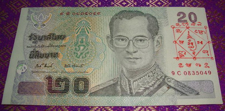 ธนบัตร 20 บาท หลวงพ่อเมตตาเขียนยันต์ หลวงพ่อเพิ่ม วัดป้อมแก้ว จ.พระนครศรีอยุธยา