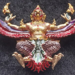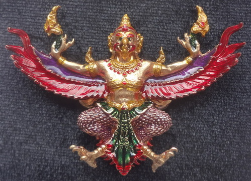 พญาครุฑทรงฤทธิ์ รุ่นบังเกิดทรัพย์ (รุ่นแรก) วัดครุฑธาราม จ.พระนครศรีอยุธยา พิธีเทวา-พุทธาภิเษก วันเสาร์ที่ 19 สิงหาคม พ.ศ.2560 (เดือน 9 ปีระกา) เนื้อตริยโลหะแดง ลงยาราชาวดี (สัมฤทธิ์ผล) ยิงโค๊ตและหมายเลข ๘๖ ขนาดกว้าง 5.8 ซ.ม.สูง 4.2 ซ.ม. จำนวนสร้าง 799 องค์