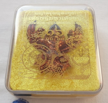 พญาครุฑพุทธบูชา วัดครุฑธาราม จ.พระนครศรีอยุธยา รุ่นเศรษฐีมหาเศรษฐี พิธีพุทธาภิเษก วันเสาร์ที่ 16 มิถุนายน พ.ศ.2561 เนื้อทองสัตตะเมฆา สัมฤทธิ์สิทธิ์อำนาจ (ปากทอง) ยิงโค๊ตและหมายเลข ๒๑๖ ขนาด 3.5 x 3.5 ซ.ม. จำนวนสร้าง 999 องค์