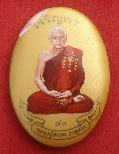 ล็อกเก็ตเจริญพร 80 ปี พิมพ์รูปไข่ฉากทองจัมโบ้ หลวงปู่สรวง วัดถ้ำพรหมสวัสดิ์ จ.ลพบุรี งานฉลองอายุ 80 ปี วันที่ 14 กุมภาพันธ์ พ.ศ.2556 พิมพ์รูปไข่ – หลังฝังพระนาคปรกเนื้อเงิน + เหรียญไก่ฟ้าเนื้อทองแดง + ตะกรุด 3 กษัตริย์ + เส้นเกษาหลวงปู่และจีวร ตอกโค๊ตและหมายเลข ๕๑ ขนาด 3.4 x 4.6 ซ.ม. จำนวนสร้าง 80 องค์