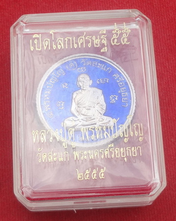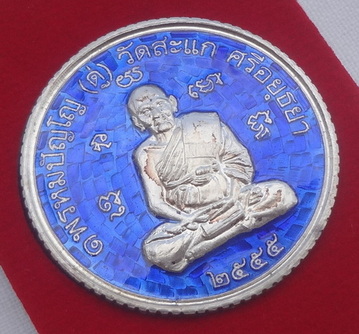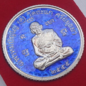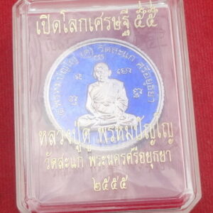 เหรียญเสมาพุทธซ้อนเปิดโลกเศรษฐี 55 เนื้อเงินลงยาสีน้ำเงิน หมายเลข ก ๑๔๒ หลวงปู่ดู่ วัดสะแก จ.อยุธยา