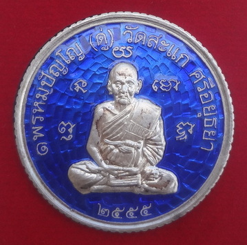 เหรียญกลมขอบสตางค์หลวงปู่ดู่ ดวงมหาเศรษฐี ปี 2555 หลวงปู่ดู่ วัดสะแก จ.พระนครศรีอยุธยา วันเสาร์ ที่ 20 ตุลาคม 2555 (ขึ้น 5 ค่ำ เดือน 11) เนื้อเงินลงยาสีน้ำเงิน ยิงโค๊ตและหมายเลข ก ๑๖๗ ขนาดเหรียญ 3.1 ซ.ม. จำนวนสร้าง 499 เหรียญ