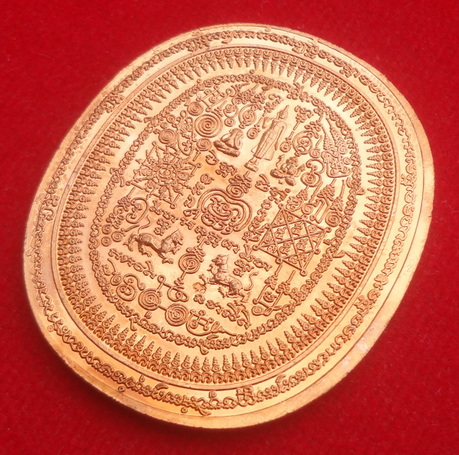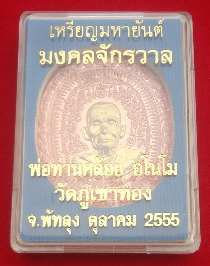 เหรียญมหายันต์ รุ่นมงคลจักรวาล พ่อท่านคล้อย วัดภูเขาทอง จ.พัทลุง ปี พ.ศ.2555 เนื้อทองแดงหน้ากากทองฝาบาตร ตอกโค๊ตและหมายเลข (ไทย) _ _ _ ขนาดเหรียญ 3.4 x 4.1 ซ.ม.