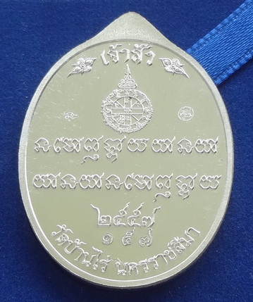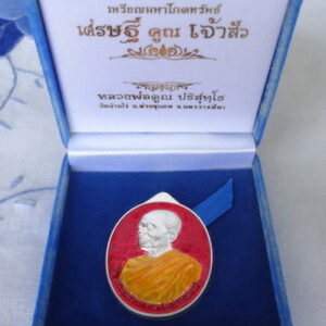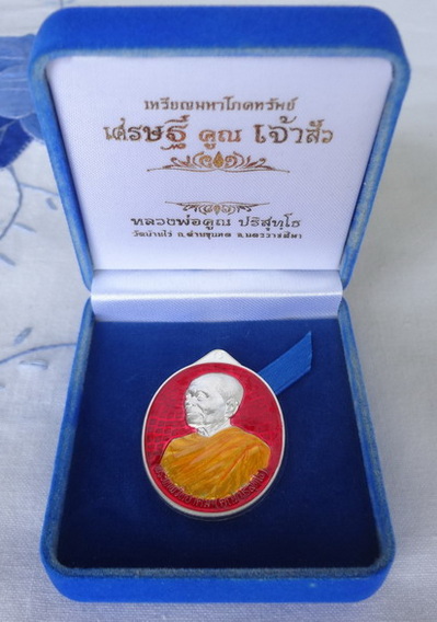 เหรีญมหาโภคทรัพย์ พิมพ์เจ้าสัว หลวงพ่อคูณ วัดบ้านไร่ จ.นครราชสีมา รุ่นเศรษฐี คูณ เจ้าสัว ปี พ.ศ.2557 เนื้อเงินลงยาสีแดง ตอกโค๊ตและหมายเลข ๑๕๗ จำนวนสร้าง 199 เหรียญ