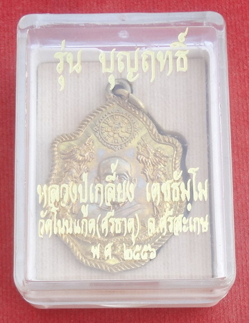 เหรียญปั๊มมังกรคู่หลังนารายณ์ตรึงไตรภพ หลวงปู่เกลี้ยง วัดโนนแกด (ศรีธาตุ) จ.ศรีสะเกษ รุ่นบุญฤทธิ์ (มหาเทพประทานพร) 17 ธันวาคม พ.ศ.2556 เนื้อทองฝาบาตร ตอกโค๊ตและหมายเลข (ไทย) _ _ _ ขนาดเหรียญรวมห่วงเจาะ (ไม่รวมห่วงแขวน) 2.8 x 3.9 ซ.ม. จำนวนสร้าง 5,999 เหรียญ