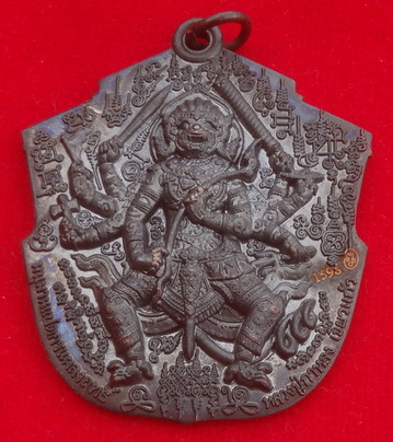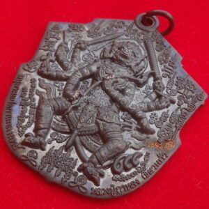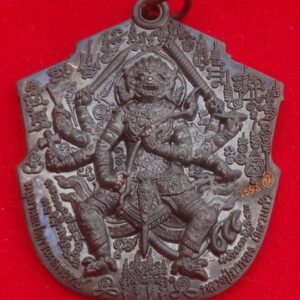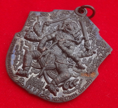 เหรียญหนุมานนำทัพแผลงฤทธิ์แปดกร หลังราชสีห์เชิญธง หลวงปู่กาหลงเขี้ยวแก้ว วัดเขาแหลม จ.สระแก้ว รุ่นเตโชชยากรณ์ สร้างอุโบสถก์หลังที่ 10 วัดวังทอง ปี พ.ศ.2552 เนื้อทองแดงผิวไฟ ยิงโค๊ตและหมายเลขเลเซอร์ 1598 ขนาดเหรียญไม่รวมห่วงแขวน 4.4 x 5.2 ซ.ม. จำนวนสร้าง 2,999 เหรียญ