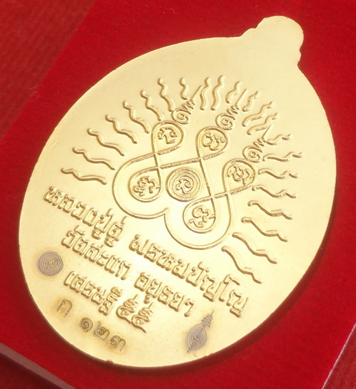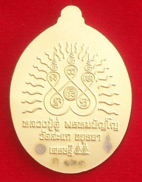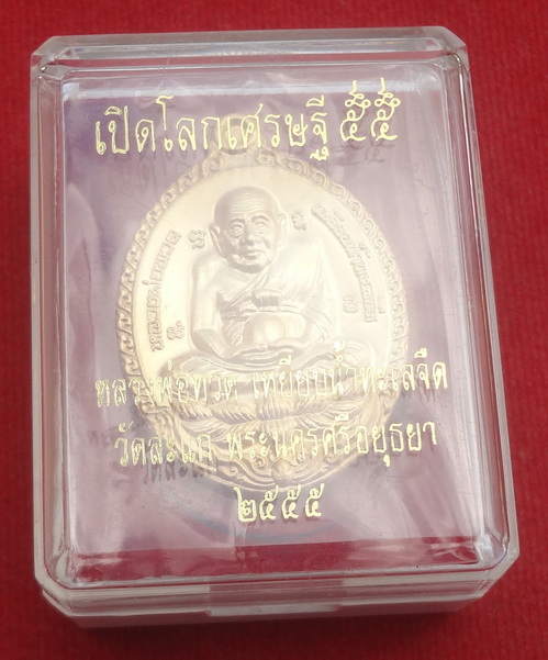 เหรียญหลวงปู่ทวดเปิดโลกเศรษฐี ปี 2555 หลวงปู่ดู่ วัดสะแก จ.พระนครศรีอยุธยา วันเสาร์ ที่ 20 ตุลาคม พ.ศ.2555 (ขึ้น 5 ค่ำ เดือน 11) เนื้อทองแดงนอก ชุบทองด้าน ยิงโค๊ตและหมายเลข ก ๑๒๓ ขนาดเหรียญรวมห่วงตัน 2.6 x 3.7 ซ.ม. จำนวนสร้าง 3,999 เหรียญ