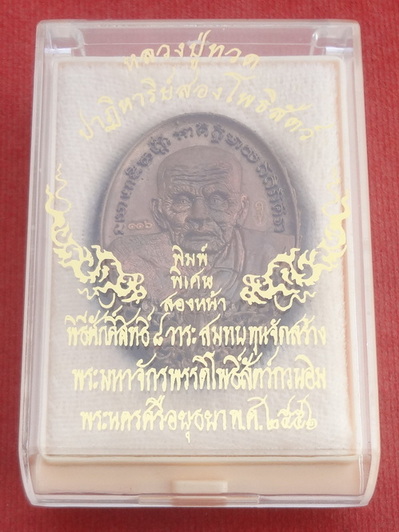 เหรียญหล่อรูปไข่หลวงปู่ทวดขอบบัวรอบ 2 ชั้น (พิมพ์สองหน้า) อุดกริ่งมวลสาร ประกอบ 6 ชิ้น รุ่นปาฏิหาริย์สองโพธิสัตว์ จ.พระนครศรีอยุธยา พิธีขอพรความสำเร็จ 6 วาระ พิธิพุทธาพิเษก 2 วาระ รวม 8 วาระแห่งความมงคล ปี พ.ศ.2556 เนื้อชนวนรวมใจลูกหลวงปู่ 2 หน้า ยิงโค๊ตและหมายเลขเลเซอร์ ๑๑๖ และการ์ดประจำองค์พระ ระบบ QR Code ขนาดเหรียญ 2.7 x 3.7 ซ.ม. จำนวนสร้าง 398 องค์