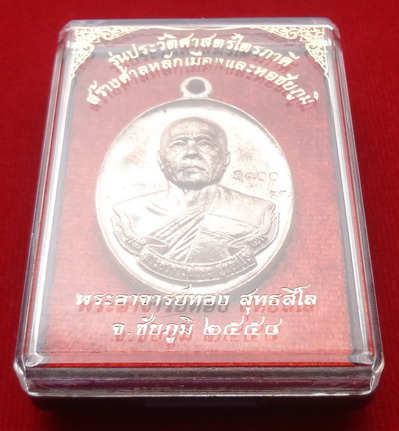 เหรียญห่วงเชื่อมรุ่นแรก หลวงพ่อทอง วัดพระพุทธบาทเขายายหอม จ.ชัยภุมิ รุ่นไตรภาคี เนื่องในวาระโอกาสสร้างศาลหลักเมืองและหอชัยภูมิ ปี พ.ศ.2558 เนื้อนวะ ตอกโค๊ตและหมายเลข ๑๘๐๐ ขนาดรวมห่วงเชื่อมเจาะ 2.7 x 4.0 ซ.ม. จำนวนสร้าง 2,999 เหรียญ