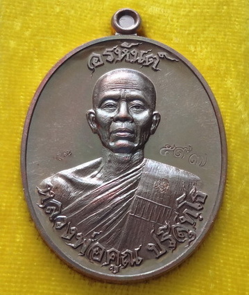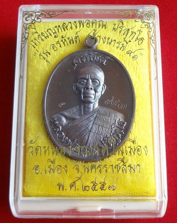 เหรียญรูปไข่ครึ่งองค์ รุ่นอรหันต์ สร้างบารมี 91 ปี พ.ศ.2557 หลวงพ่อคูณ วัดบ้านไร่ จ.นครราชสีมา เนื้อทองแดงรมมันปู ตอกโค๊ตและหมายเลข (ไทย) _ _ _ ขนาดเหรียญไม่รวมห่วง 2.7 x 3.4 cm. จำนวนสร้าง 3,000 เหรียญ