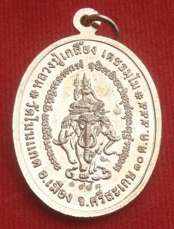 เหรียญรูปไข่ครึ่งองค์ หลังเทพเทวดาทรงช้างสามเศียร หลวงปู่เกลี้ยง วัดโนนแกด จ.ศรีสะเกษ อายุ 106 ปี รุ่นเจริญพร ยอดฉัตร 21 ธันวาคม พ.ศ.2555 เนื้ออัลปาก้า ตอกโค๊ตและหมายเลข (ไทย) _ _ _ ขนาดเหรียญรวมห่วงเจาะ ไม่รวมห่วงแขวน 2.5 x 3.8 ซ.ม. จำนวนสร้าง 1,999 องค์