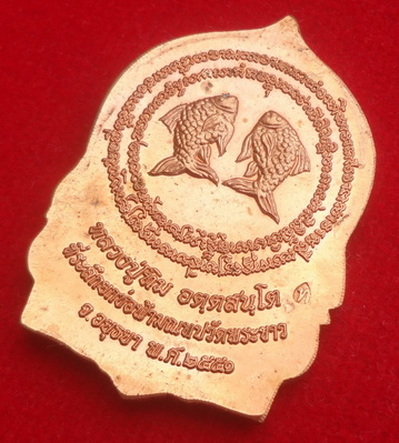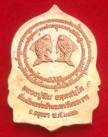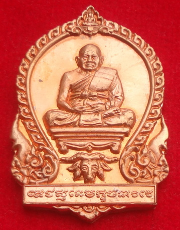 เหรียญเสมาหน้าวัว (เหรียญยกช่อฟ้ามณฑปลายรดน้ำ) หลวงปู่ทิม วัดพระขาว จ.พระนครศรีอยุธยา ปี พ.ศ.2551 เนื้อทองแดงนอก เป็นรูปหลวงปู่นั่งเต็มองค์ด้านล่างเป็นรูปหน้าวัวหมายถึงปีเกิดของหลวงปู่ ด้านหลังเป็นปลาตะเพียนคู่เอกลักษณ์แห่งเมตตา-โชคลาภ ตอดโค๊ต ท หยดน้ำ ขนาดเหรียญ 2.5 x 3.5 ซ.ม. จำนวนสร้าง 10,000 เหรียญ