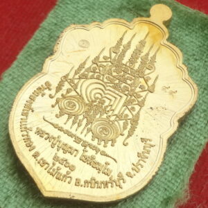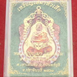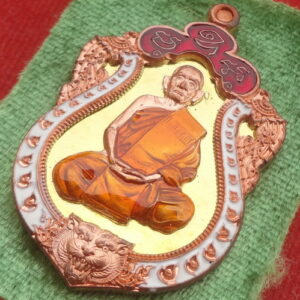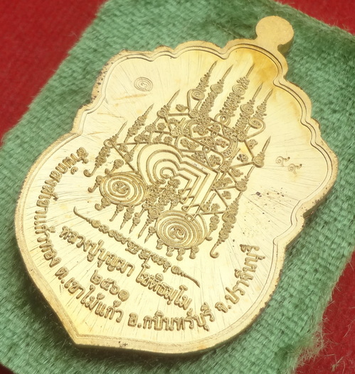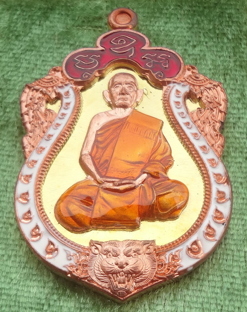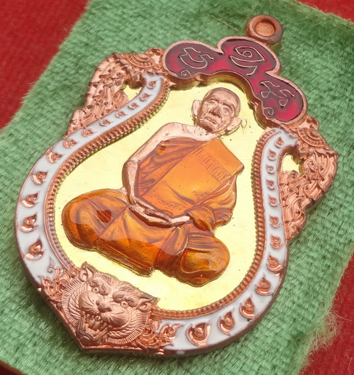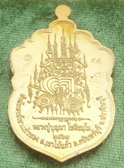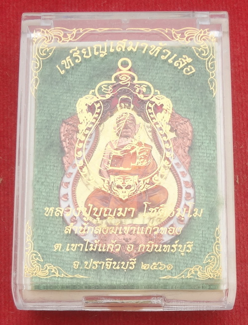 เหรียญเสมาหัวเสือ รุ่นแรก ปี 61 เนื้อทองฝาบาตร หน้ากาก/ขอบทองแดง ลงยาบนสีแดง/ขอบสีเขาว/จีวรเหลือง หมายเลข ๙๙ หลวงปู่บุญมา วัดบ้านแก่ง จ.ปราจีนบุรี